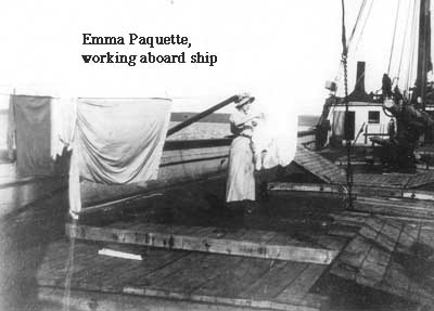 Emma Paquette aboard shipEmma, born April 13,1882, was the first child of Edward and Anna Paquette. A vivacious young woman who held many types of jobs to help support the family, she would at times sail with her brother, Edmund, and his wife, Alice, and help to "keep ship." Return to Family Photo Gallery